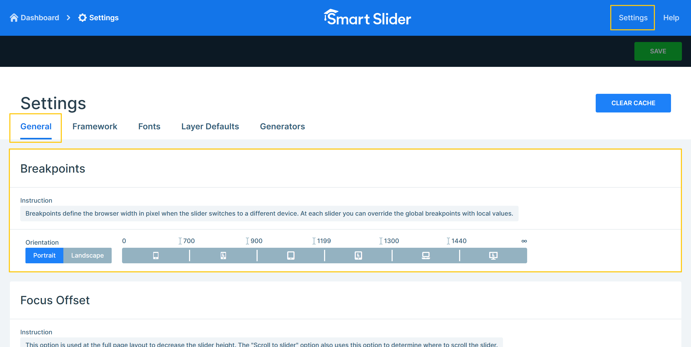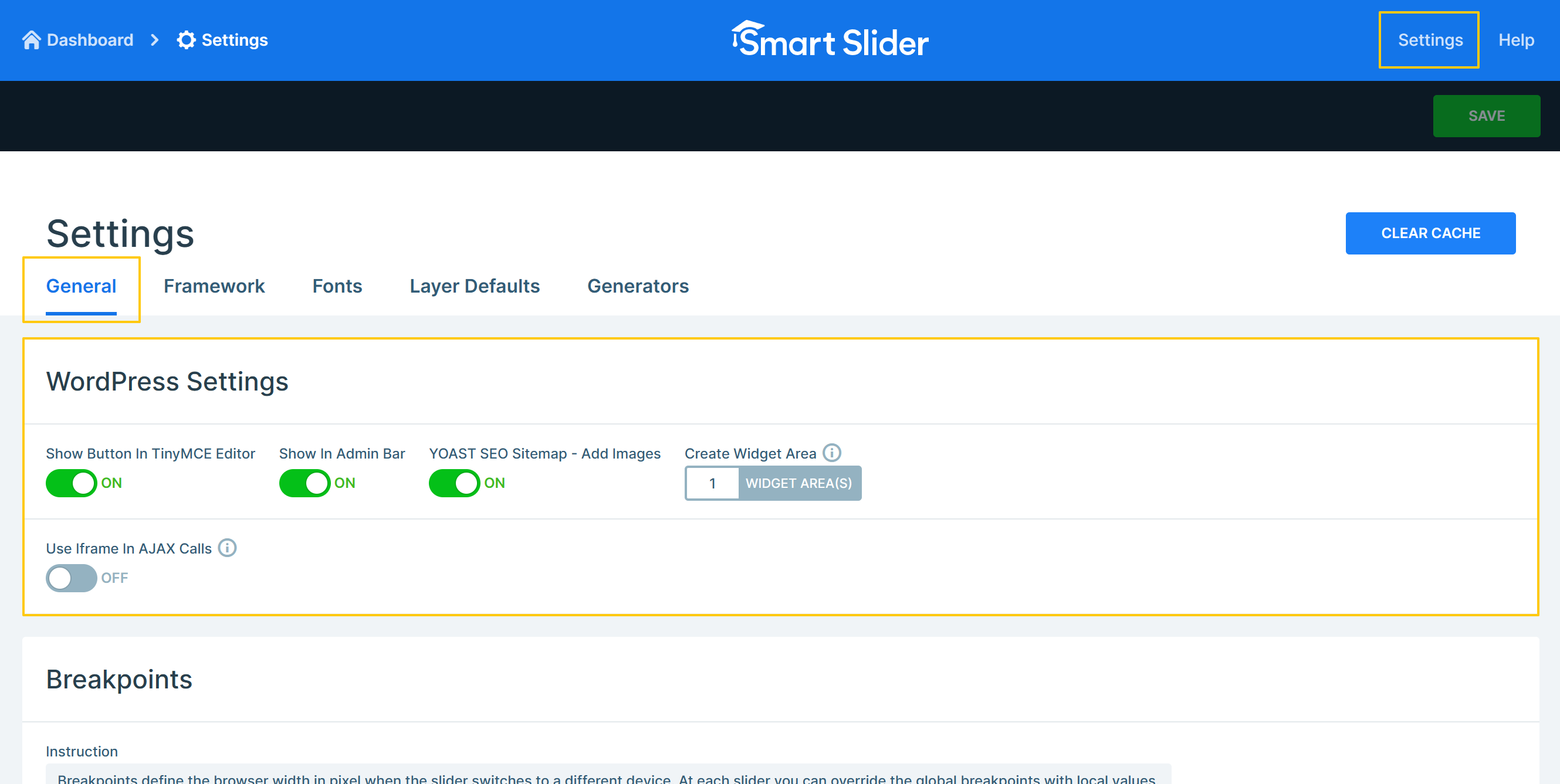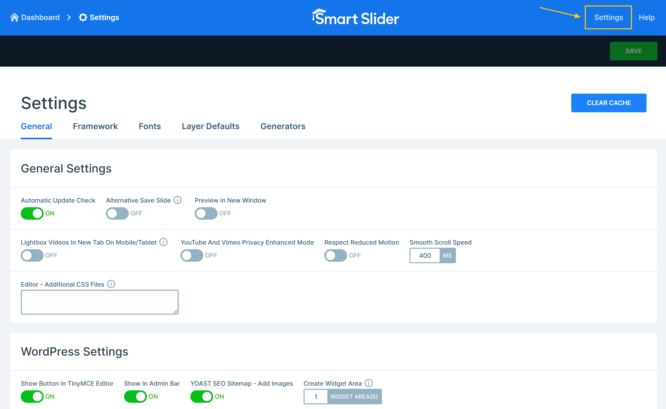 You can reach the Global Settings from the Header bar on both the Dashboard and the Slider settings page.